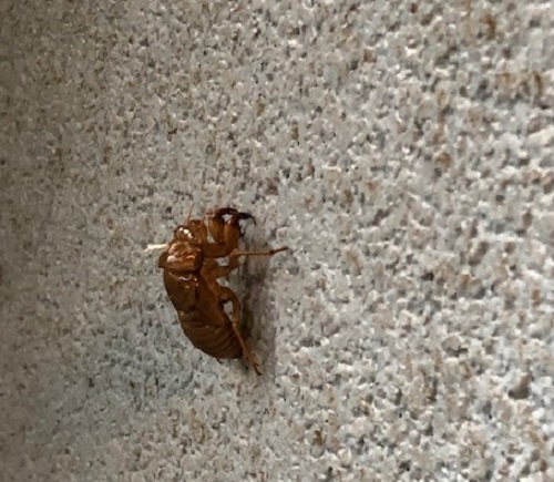 - 我が家の玄関を開けて入ろうかと思う、ちょうどその横に蝉の抜け殻がしがみついている。