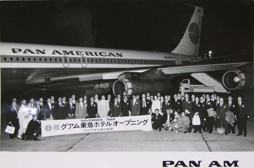 なんと「グアム東急ホテル」のオープン時の写真。もはや誰も知らないが、かつてグアム島に「東急ホテル」があった。 1969年にホテルがオープンした時に、一行が訪れた時の写真で、これも今は無きパン・アメリカン航空にとっても期待のほどが伺える写真である。 しかも、五島昇の環太平洋計画の戦略の一つとして期待のホテルであった。 また他社に先駆けてのグアム島進出でもあり、相当気合が入っていた、いや、厳密にいえば藤田ホテルが68年に開業、そして東急ホテル、翌年に第一ホテルとなったはずである。 しかし、その立地はグアム島で最も素敵なビーチと言われた場所であったのである。 低層の鉄筋コンクリートのこじんまりした建物で、屋根に南の島の雰囲気をとヤシの葉で屋根を葺いた。 しかし、これが失敗の元であった。グアムは年中台風がくる、それも尋常でない。 そのためヤシの葉の屋根は吹っ飛んでしまう。その代わりにすぐに修理をすればよいのであるが、なんだかんだと言って、東急社内の途中に入った人間がはぐらかし、社長の耳に入らない。 屋根はそのまま捨て置かれる。 お客から見れば非常に情けないホテルに見える。 という事もあり、そのうちにヒルトンホテルが立派なものを拵えてしまった。 あっという間の転落である。 その後は、ベトナム戦争の難民収容所に使われたりしていたが、やがて売られていった。 場所が良かっただけに惜しかった。 72年、ヨッコイショウイチの横井正一さんが発見された時など、現地人がまず東急に連れて行こうと、言う事に話がまとまったというから東急の知名度は相当な物であっただけに実にもったいないことをしたものである。