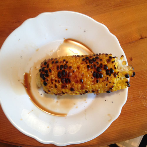 廻しながら焦げ目が付いたら醤油を塗りながら又焼く。 写真の通りの「焼トウモロコシ」。