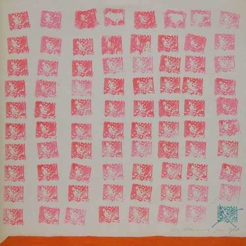 右下に Han Bennink 本人のサインがある。 全体におしてあるハンコ(スタンプ)は鶏の絵が彫られたものである。 それを全面にびっしりと押してある。 ただ押し方に少しづつ違いが出ていて、ひねりを入れてある。 その辺りが実に面白い。 それで、一体どういう絵柄なのかという観客の疑問に、ちゃんと答えていて、右下のグリーンのスタンプ。これだけが綺麗に押されている。 ところが不思議な事に、そのもっともきちっとした印影をわざわざ、バッテンで線を引いて否定するという暴挙に出たのである。 きっと、色の違うものは排除される、または、きちっとした真っ当な物は排除されるのだと、言わんかのようである。 流石、アナーキーなハンさんである。
