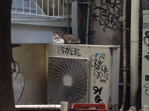 例の猫は何故か、一番低い室外機に座っていた。 しっかり香箱座りをしているのが可愛い。