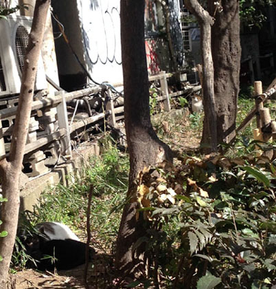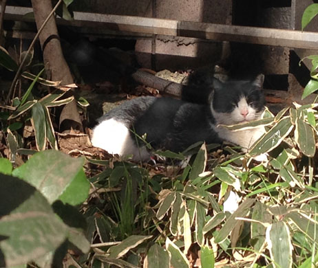 寒くても明るく生きようと、自分を励まして強風の中を歩いて、歌舞伎町の方向へ行くと、いつもの猫はお休みで、代わりに黒い「八割れ」のノラちゃん。藪の中でじっとしている。 ちょうど太陽の日の当たり方が具合が悪いライティングになってしまったが、ご勘弁。