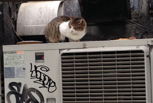 今朝は、例のノラ君は室外機の上に陣取っていた。 エライ張切っている様子なのでよく見れば餌を沢山頂いたようで、それを守っていたのだ。