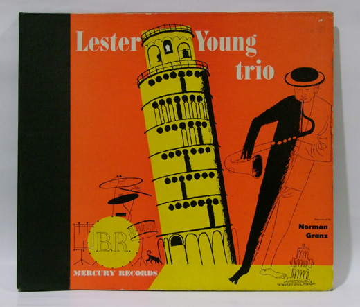 その貴重なものは、なんとレスターヤングのSP(78回転盤)2枚が収まったアルバムである。 レコード会社はMERCURYである。 アルバム(箱)の背文字にC104と番号が打たれている。 後に10インチでも発売され、CLEFでもラベルを変え同じ番号で発売された人気盤である。 今回のアルバムは12インチ(30センチ)盤のSPである。 ジャケットは、ピサの斜塔の絵柄で、10インチ盤の第1集にあたるので、赤地に黄色のデザインである。 アルバムの裏はエンジ色の重厚な紙で覆われていて、全体の造りを見ているとコレクター心がそそられる。