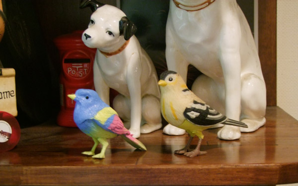 右側の黄色の小鳥は、当店の開店当時に前にいた店のお姉さんが、お客様が入って来たら鳴くので便利で良いからとそのまま、置いていったものである。 以来、店で客寄せとして頑張っていたのだが、働きすぎなのか電池交換しても鳴かなくなってしまった。 仕方なく先日、小物を売っている店で購入して来たのが青い方。 これが又働き者で、よく鳴く。 古い方は、お役御免で捨てようかと思ったが、それが申し訳ないので、そのままにしておいた。