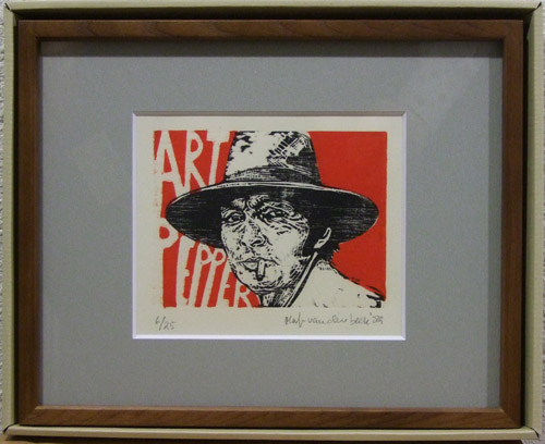 絵は、アムステルダム在住の画家で、オランダではちょっと名の知れた人。 アートペッパ−の帽子をかぶった姿を木版画にしたもの。 本人サイン 6/25 作ったのは、80年代との事だった。 絵のサイズ 横 17cm X 縦14cm (額 32 x 25) (売却済)