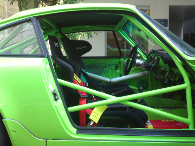 好きだねオレも964が。 これはトンデモナイ車だった。 前のオーナーは私の友人だったのだが、本格的にレース参戦のため964の安いのを購入。 それにチュ−ニングを施した。 250馬力しかないエンジンはそのまま特徴を生かすことにし手を入れないで、徹底的に軽量化を施した。 250馬力では今時どうしようもなく、軽くするしか方法はない。 彼はちょっとお金があったらしく、私のようにFRP(プラスチック)では無くカーボンを奢った。 屋根など鉄板を切り取り、特注カーボンで作り変えるという手の込みよう。 勿論ボンネットもそう。 サスペンションは、メーカー名は忘れたが当時世界一と言われたサーキットのコースによって硬さを調整できるようなものであったが、残念ながら私は使いこなせなかった。 椅子、内貼り、エアコン、等々剥がせるモノはすべて取り去っていて、スパルタンな一台。 マフラーもどこぞの一流品という触れ込みの大きな音である。 もちろんウイング、ロールケージはセットである。