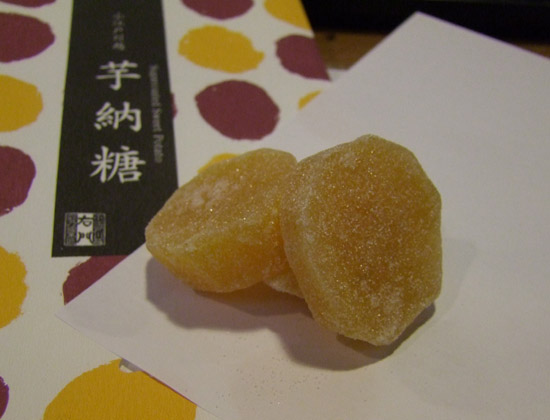 店内をブラブラしていると、売店のオバサンと目が合ってしまい、にっこり微笑まれていらっしゃいと吸い込まれてしまった。 それで購入したのがこれ。 いもなっとうだが、漢字で芋納糖と書かれている。 皮は取り除かれていて、ありゃ、芋を放棄かと思う程、見た目はまるで栗のような上品さ。 袋に印刷された社名を見ると「右門」と言うらしい。 なかなか美味しい、いもなっとうであった。 しっかりしてしかも硬すぎず柔らか過ぎず、さつまいもの甘みに砂糖の甘みがたっぷり乗って中々の逸品。 くりより美味いじゅうさんり、というが如し。美味しかった。 次回も通ったらまた買おう。 解っていたら行きに買ってお土産に出来たのにと、ちょっと悔やんだ。
