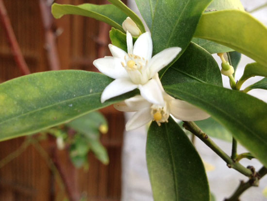 かすかに漂う優しい匂いに心誘われて、振り返り見れば、可愛らしい白い花。 しばらく前、確かこの木には金柑の、黄色い実が生っていたはず。