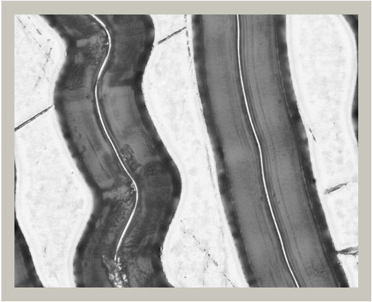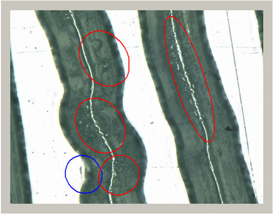 1. 現状での溝の状況について、顕微鏡写真を見て頂きたい、まづ@溝の底部に削れたビニールカスが付着、A溝側面が変形してコブ状になっており、平滑さが失われている、B溝上部(表面に近い部分)に剥離が発生している、といった状況で、かなりのダメージを受けている。 おそらく摩耗した針を使用し、針圧が不適切できちんと溝をトレースされなかったために、このような状況に陥ったものと思われる 2.洗浄後に関しては、ある程度の削れカスは除去されてた。削れたビニールのカスも取れたが、実験なので再度参上はしなかったので、今回は、盤と繋がってしまったものまでは除去できなかった。
