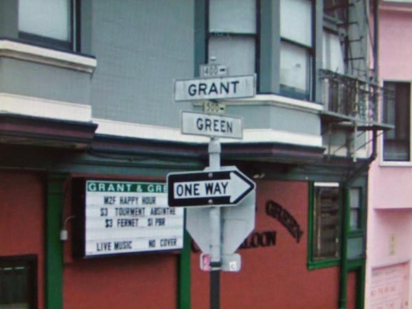 すると、やっぱりあった。 次の写真の通りである。 標識も、標識を付けられたポールも昔のままかどうかは分からないが、兎に角1400 GTANT 500 GREEN となっている所など全く一緒。 因みに後ろの店はグラント&グリーンという名前である所が恐れ入る。