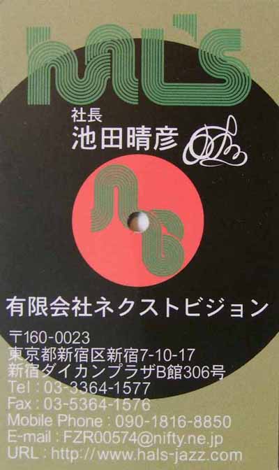 いや、派手な名刺。 名刺の真ん中には穴があいている、レコードマニアならピンとくる、スピンドル・マークの穴を空けるという懲りようで、おまけに名前の後ろにはなんと花押が。 戦国武将のようになってしまった。