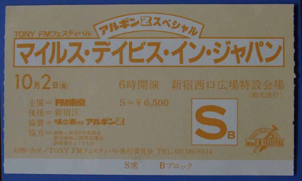 マイルスのコンサート。 開催が10月2日であるから1981年だった。マイルス復活コンサートの一環だ。 場所は、新宿西口広場特設会場 雨天決行、気合十分って当たり前か。 S席 6500円。 まだ新宿の高層ビルが全部立つ前だったので、空き地でこんなことが出来たのだろう。 チケットを見ると、後援=新宿区。協賛=味の素kkアルギンZ、道理で当日ドリンクを配っていたような記憶がある。協力=新都心新宿PR委員会、新宿新都心開発協議会、西新宿をよくする会、と訳の解らない会の名前が連なる。